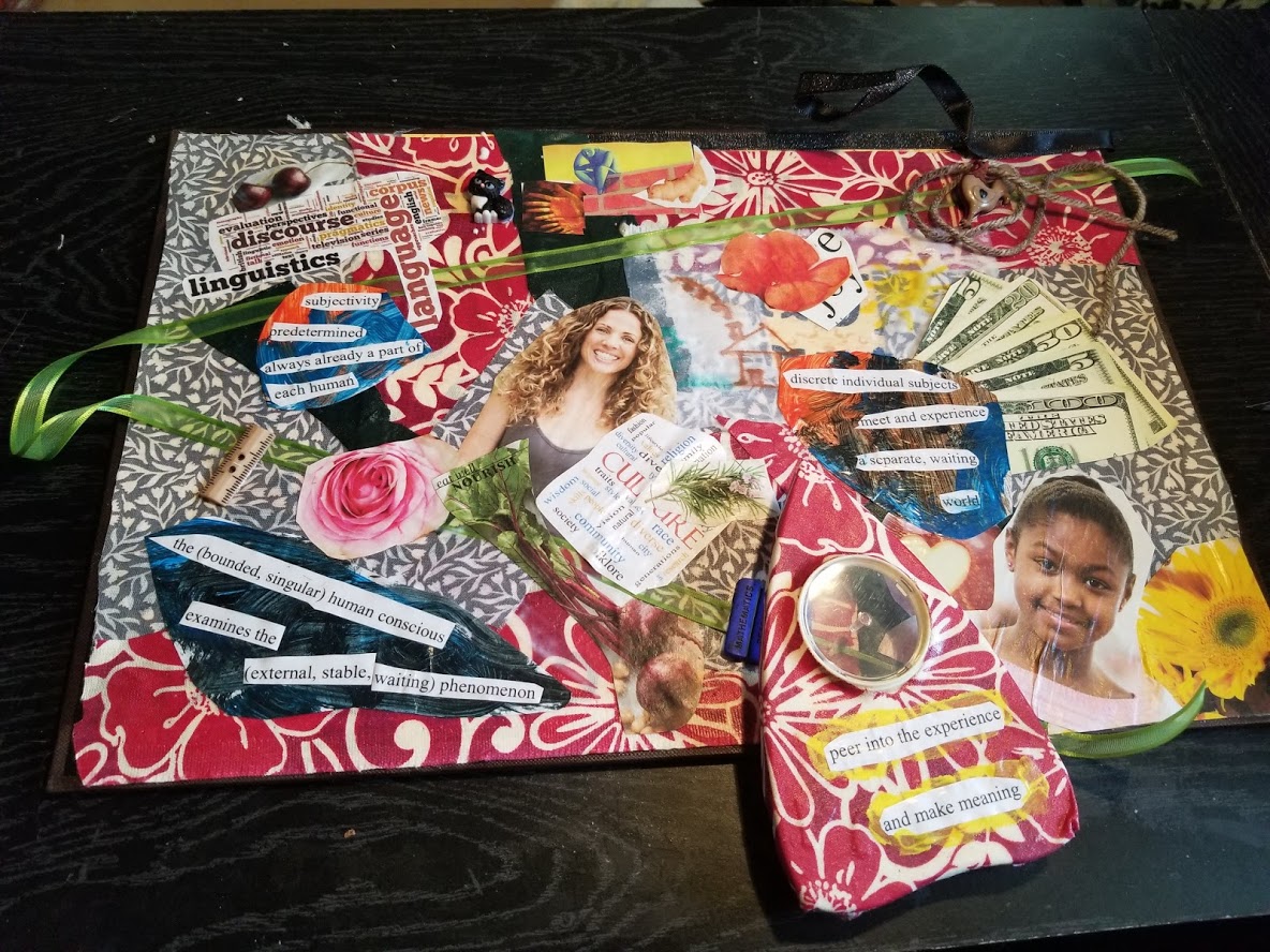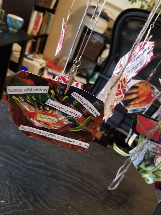 This was a structured post session, based around the contributors to Mark Vagel, Brooke Hofsess, and Jaye Johnson Thiel‘s special edition of the journal Qualitative Inquiry on post-phenomenology and hermeneutic inquiry. For the session, I reimagined an early draft of my paper Towards a Phenomenology of the Material as an interactive art piece. I used two sets of identical materials to create a pair of objects. First, I created a flat board with viewing apparatus to simulate the experience of doing traditional inquiry. Next, I made a mobile to simulate the challenges, rewards, and possibilities of viewing the same material using different methods.